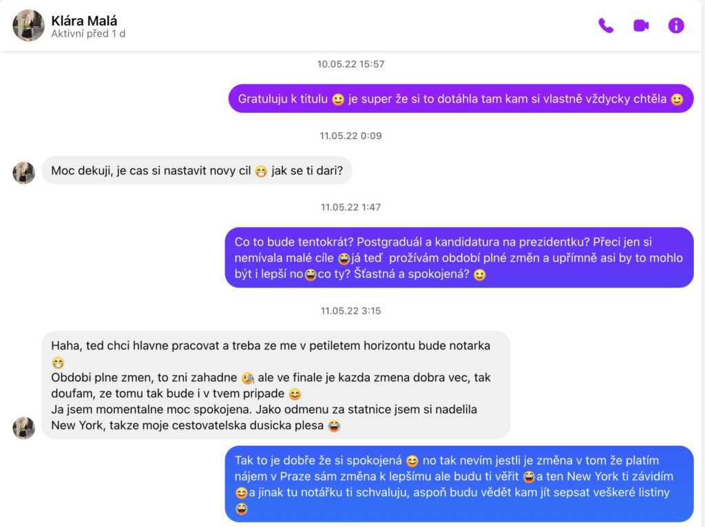 Ale vás asi zajímá, jak se stalo, že jsme opět spolu a můžeme se tak sejít na našem velkém dni. To si tak Kuba prohlížel z nudy sociální sítě a viděl, že Klárka dosáhla velkého úspěchu ve svém životě – získala magisterský titul na svých vysněných právech. A tak jí jako správný kamarád (se kterým asi tak 7 let Klárka vůbec nebyla v kontaktu) napsal gratulaci. A jelikož si (špatně) myslel, že je Klárka sama, začal si s ní psát v naději, že by z toho třeba mohlo něco vzniknout.